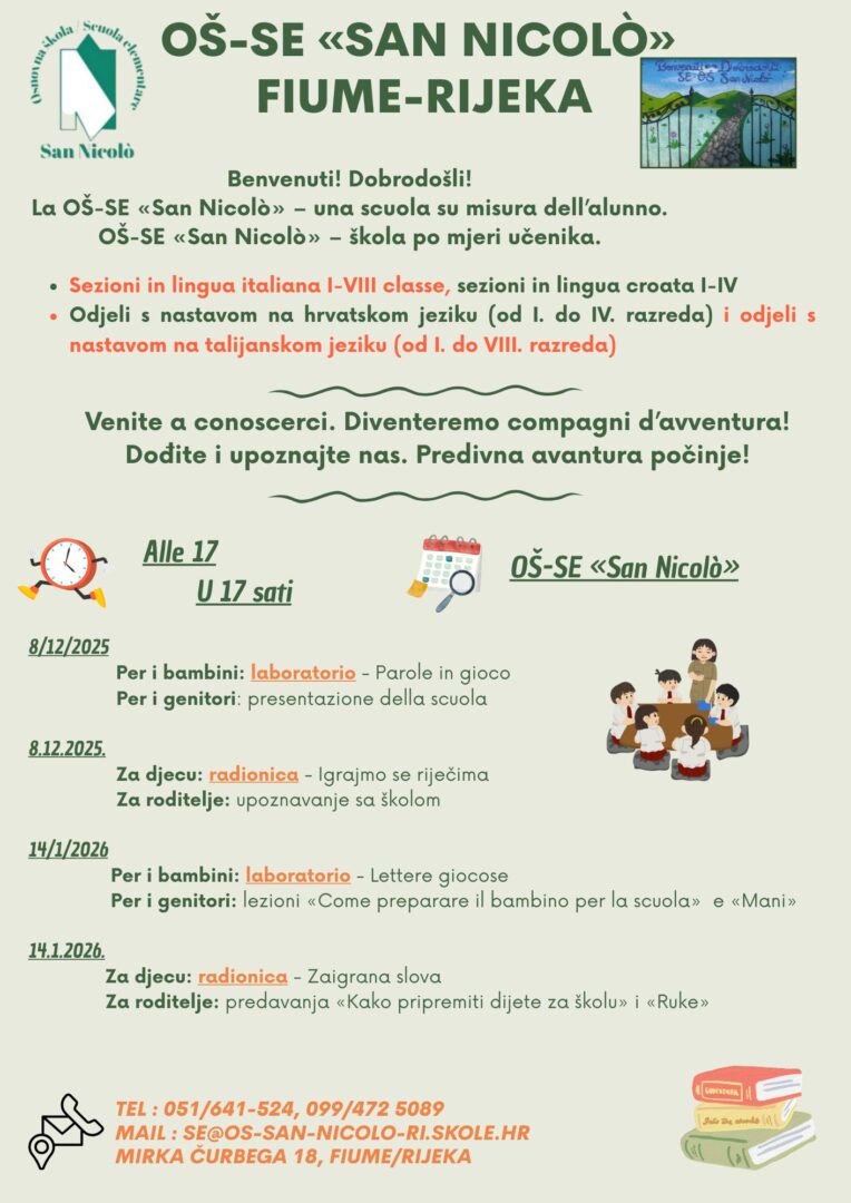 OŠ-SE „San Nicolò“ organizira dane otvorenih vrata za buduće učenike prvih razreda odjela na talijanskom i hrvatskom jeziku. Radionice i predavanja održat će se 8.12.2025. i 14.1.2026. godine s početkom u 17:00 sati.